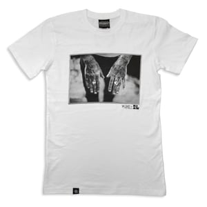White Tee with 3 colour Tom Gould photo print on front and black RI&W logo print on back.